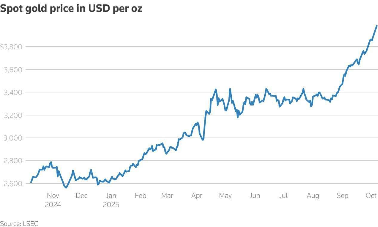 امروز چهارشنبه قیمت هر اونس طلا با عبور از مرز ۴۰۰۰ دلار، به رکورد جدیدی دست یافت. بالارفتن تمایل به سرمایهگذاری امن در مواجهه با ناثباتیهای اقتصادی و ژئوپلیتیکی و همچنین انتظارات برای کاهش بیشتر نرخ بهره توسط فدرال رزرو ایالات متحده علت افزایش امروز قیمتها بوده است. به گزارش رویترز، قیمت طلای اسپات با ۰.۹ درصد افزایش به ۴۰۱۷.۱۶ دلار در هر اونس تا ساعت ۴:۴۲ به وقت گرینویچ رسید. معاملات آتی طلای ایالات متحده برای تحویل در ماه دسامبر با ۰.۹ درصد افزایش به ۴۰۴۰ دلار در هر اونس رسید.